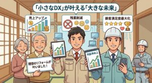 「DX(デジタルトランスフォーメーション)」と聞くと難しく感じますが、その本質は「現場の負担を減らし、お客様の満足度を上げること」にあります。特にリフォーム業は、現場ごとの個別性が高く、細かい仕様変更が頻発するため、DXによる「情報の見える化」の恩恵を最も受けやすい業種です。明日から実践できる、利益率向上のための活用術をまとめました。